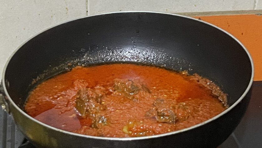 Step 7: Once the oil is hot, add the blended tomatoes mixture